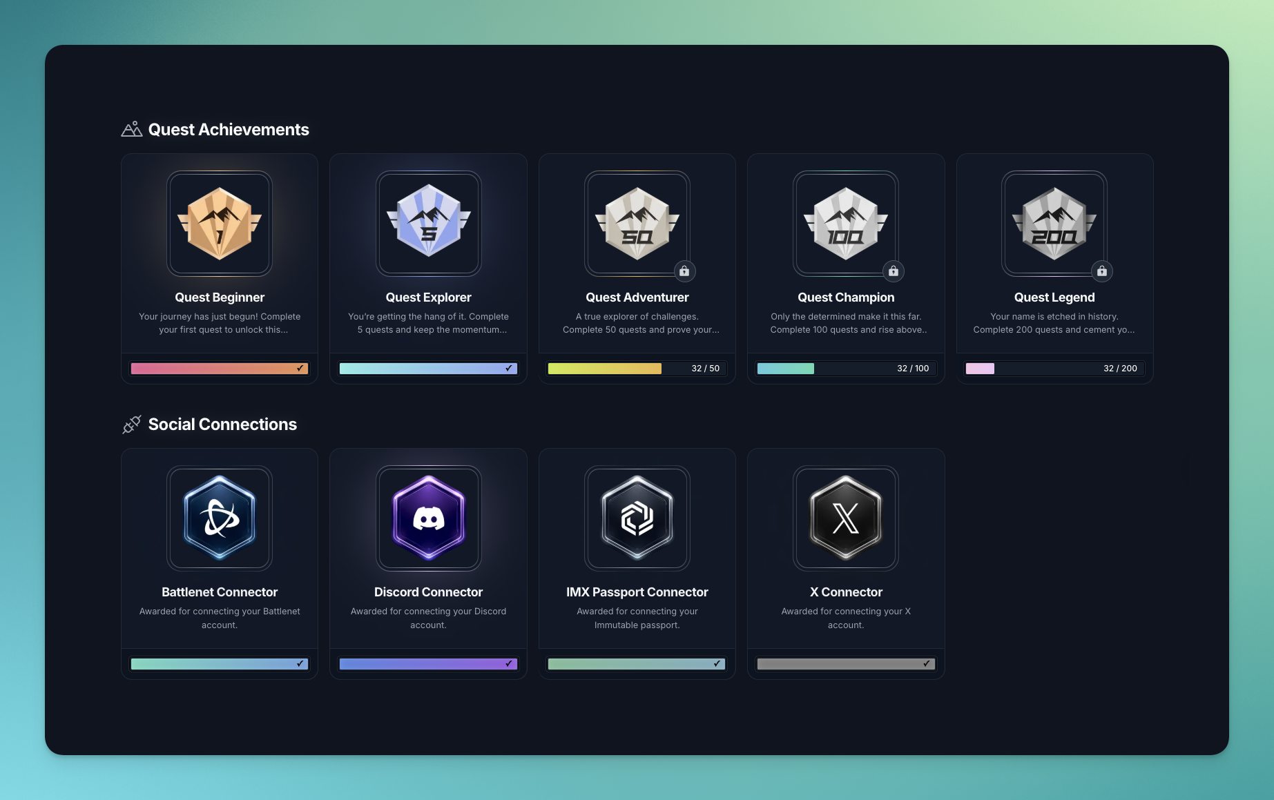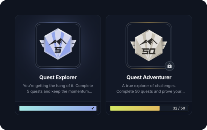 • Quest Achievements: Complete 1, 5, 50, 100, or 200 quests to unlock milestones.