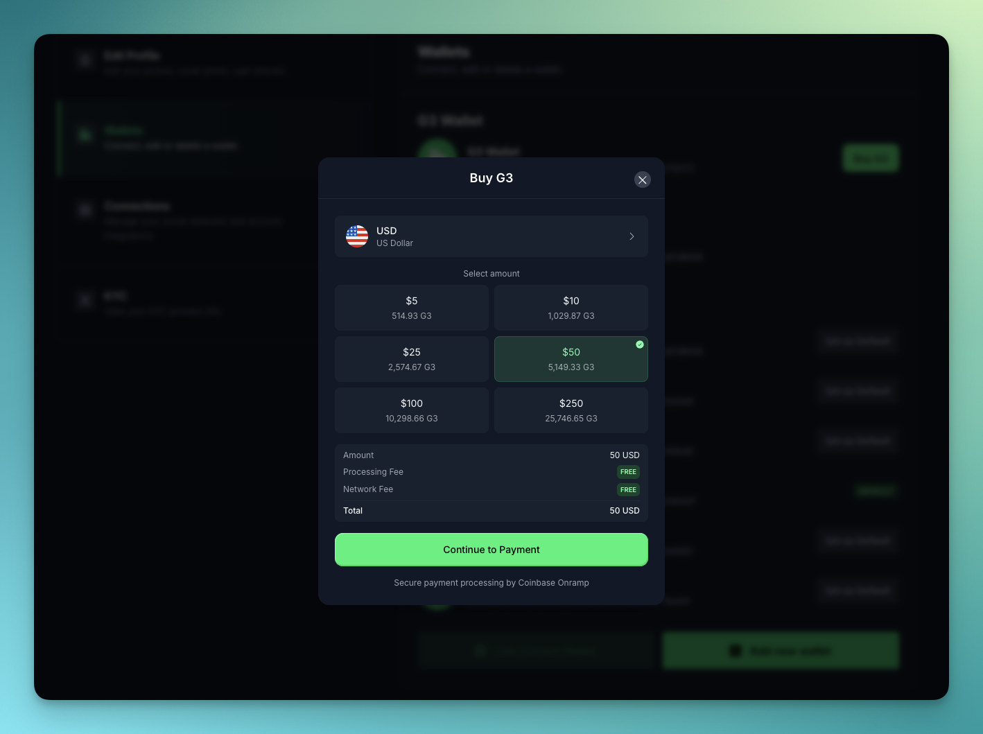 You can now buy G3 directly with your credit card with no fees, fully integrated into the G3 Smart Wallet and powered by Coinbase Onramp.